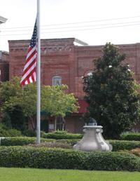“Lest We Forget” The words etched in stone on the side of the Confederate monument in front of the Onslow...